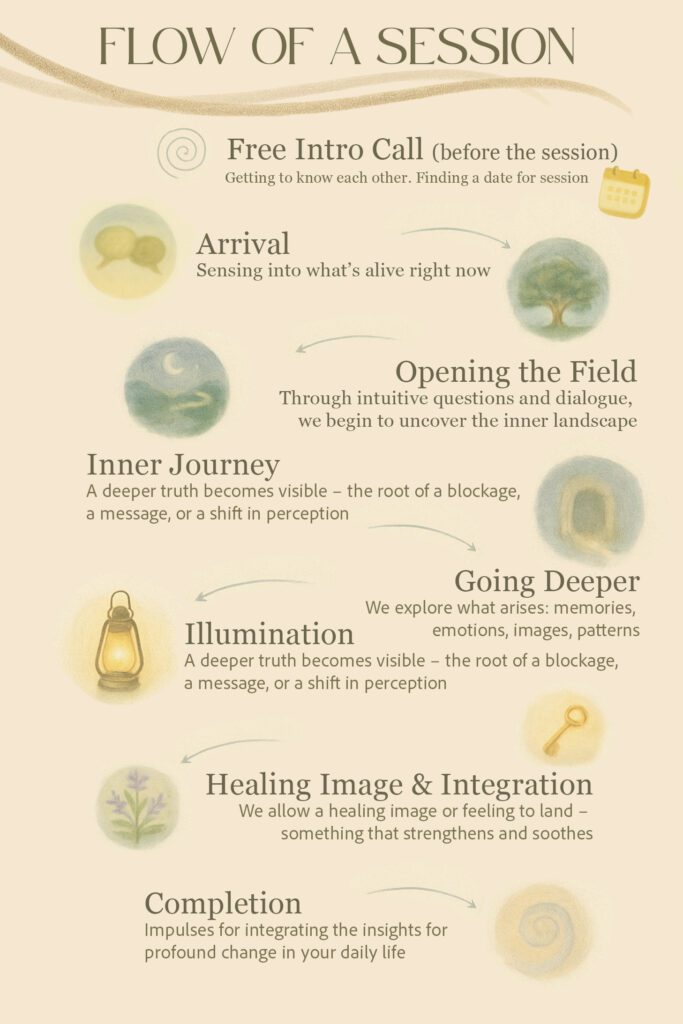 We begin by arriving together in presence. From there, the session unfolds naturally — through gentle questions, deep listening and often a guided inner journey.